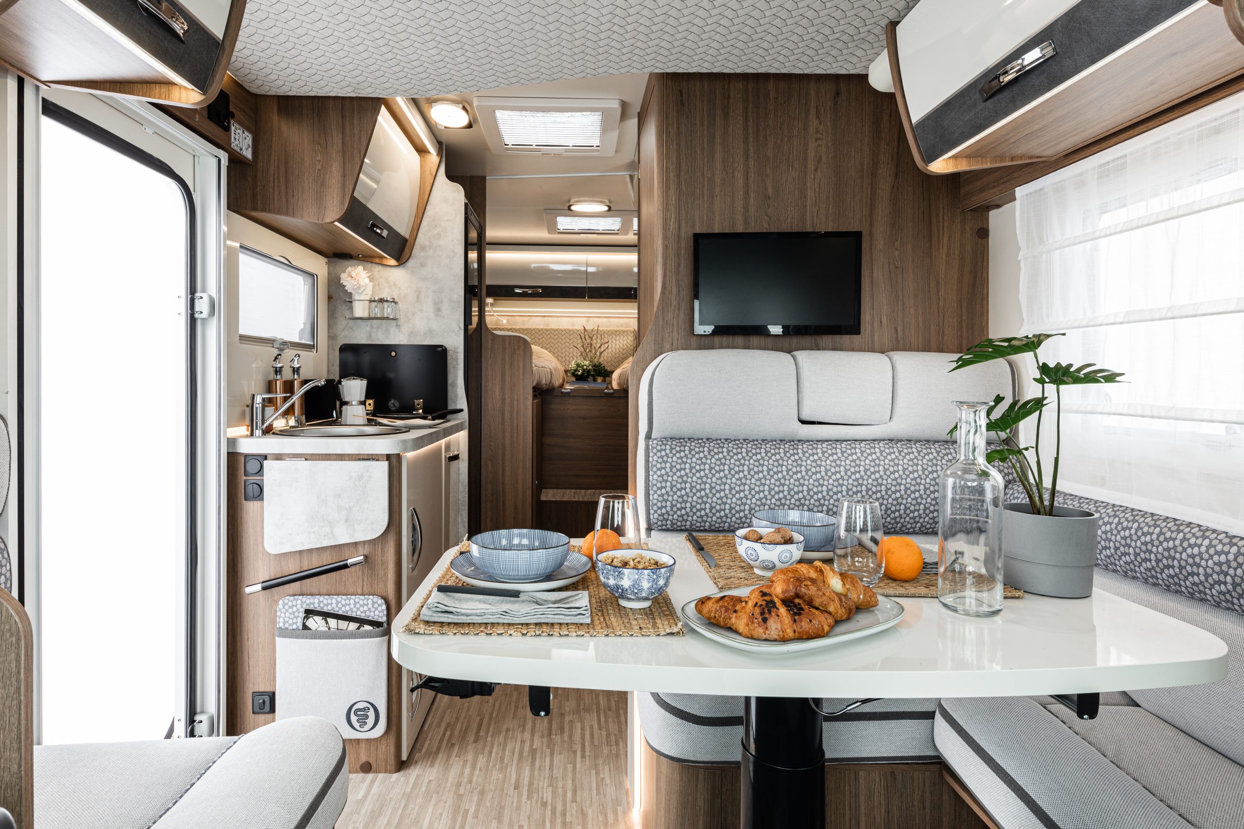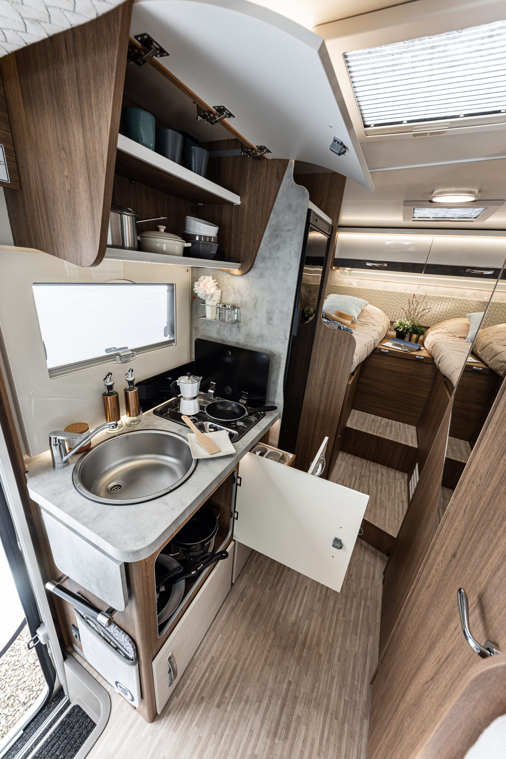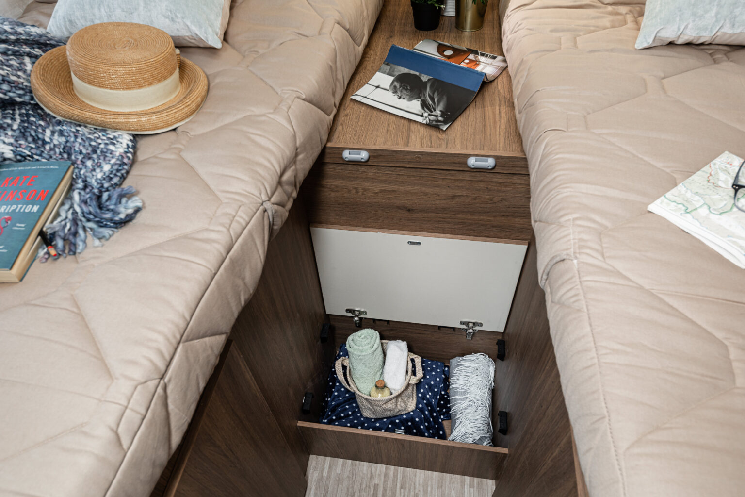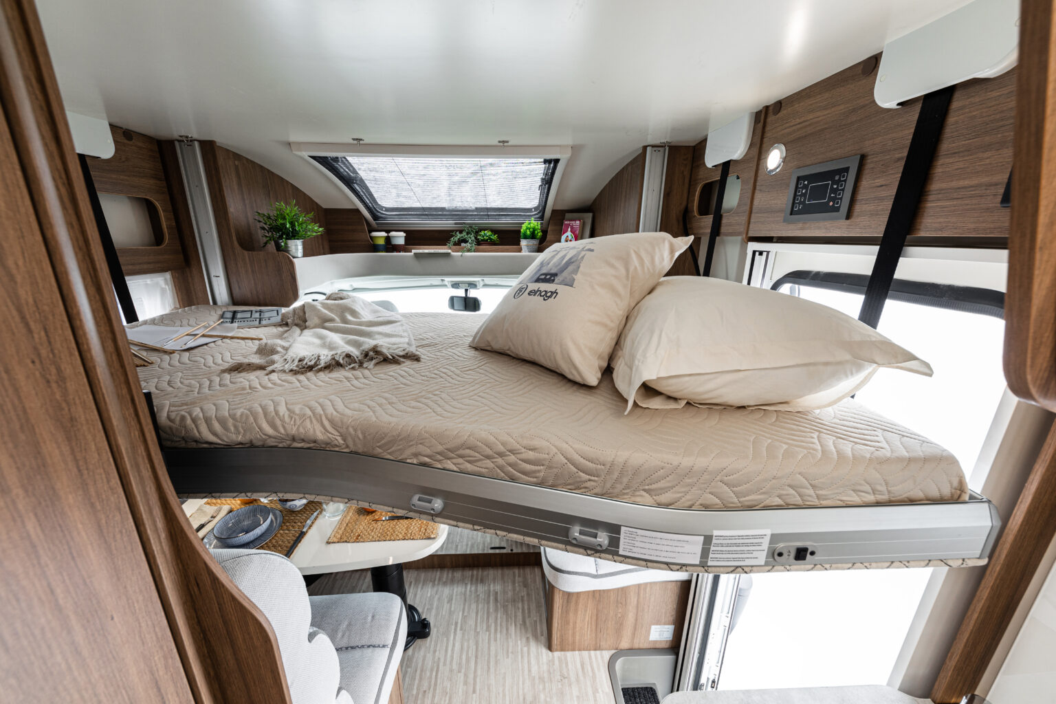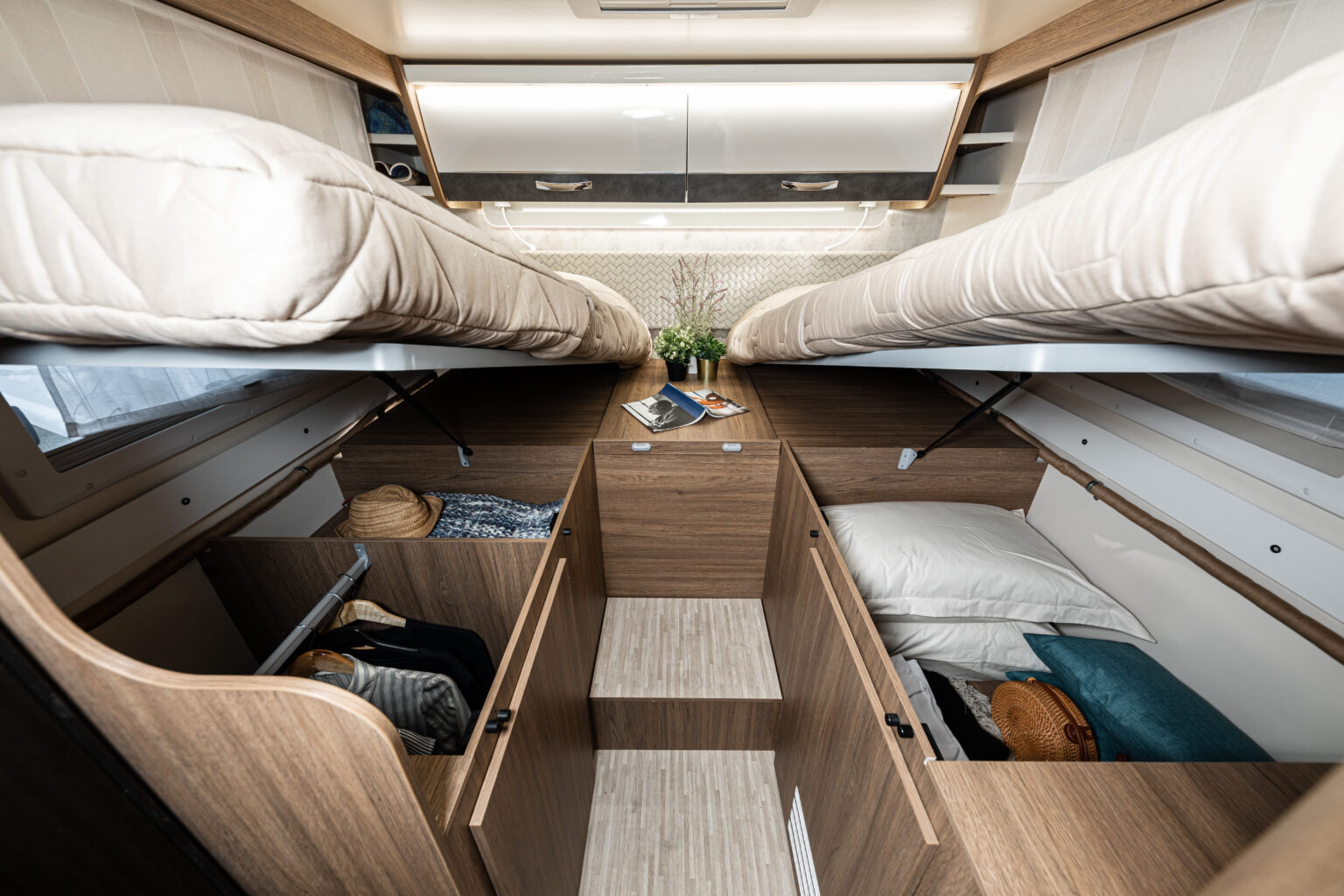 Elnagh Baron 565 se remarcă printr-un design interior unic, care asigură confort și flexibilitate pe parcursul fiecărei călătorii. Paturile din spate sunt o combinație ingenioasă de dimensiuni și forme, pentru a oferi maxim de confort: două paturi single de 191×80 cm și 204×80 cm, care se pot transforma într-un pat matrimonial extra-large de 178×212 cm, perfect pentru un somn odihnitor.