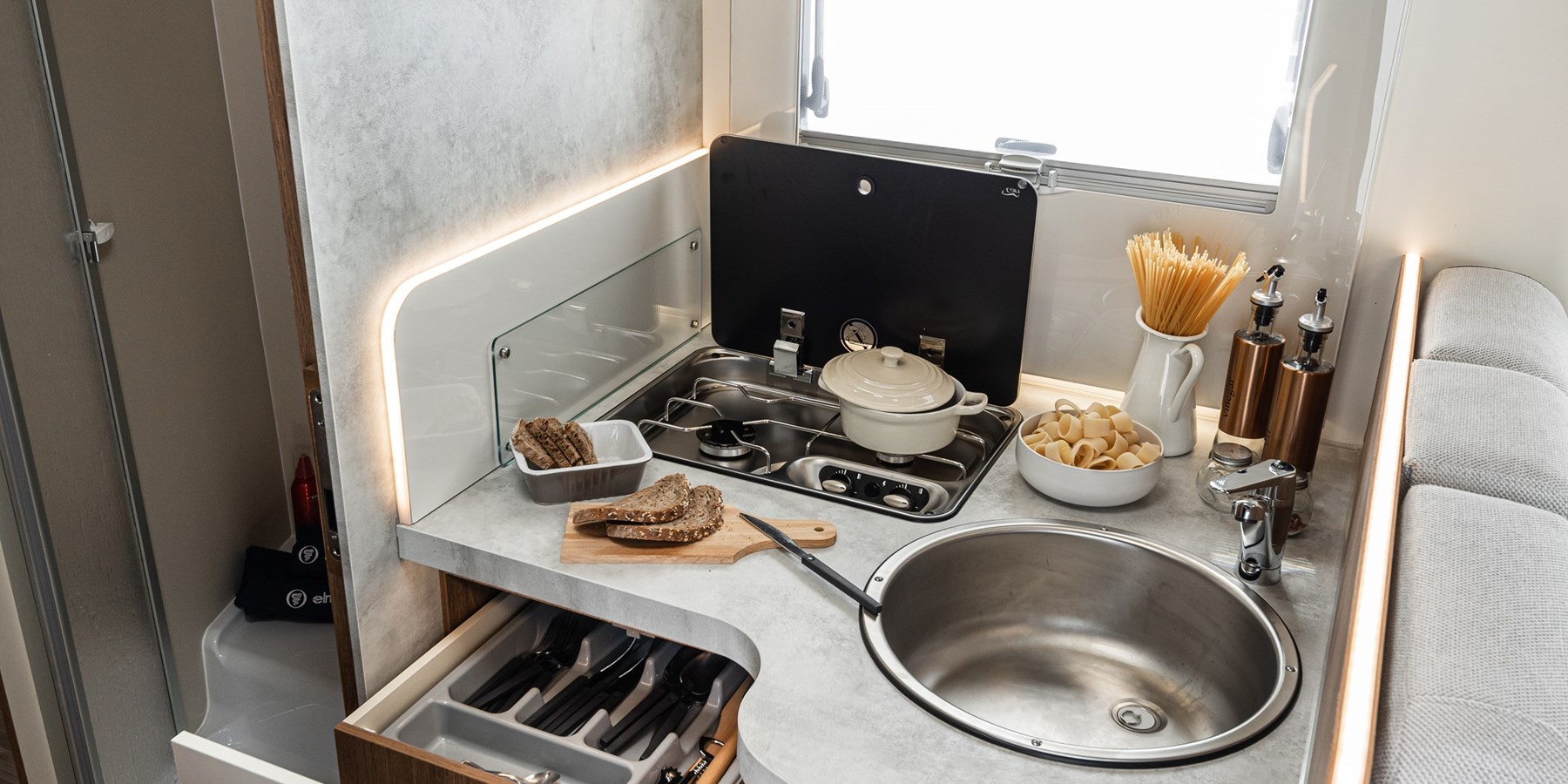 - Capacitatea rezervorului de apă curată este de 120 litri, iar rezervorul de apă uzată are o capacitate de 100 litri, ceea ce asigură independență și autonomie pe drumuri mai lungi, fără a fi nevoie de opriri frecvente pentru reumplerea sau evacuarea apei.