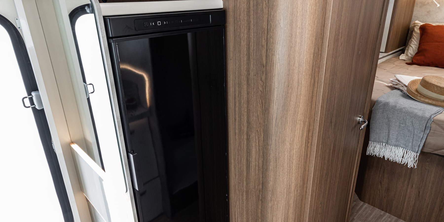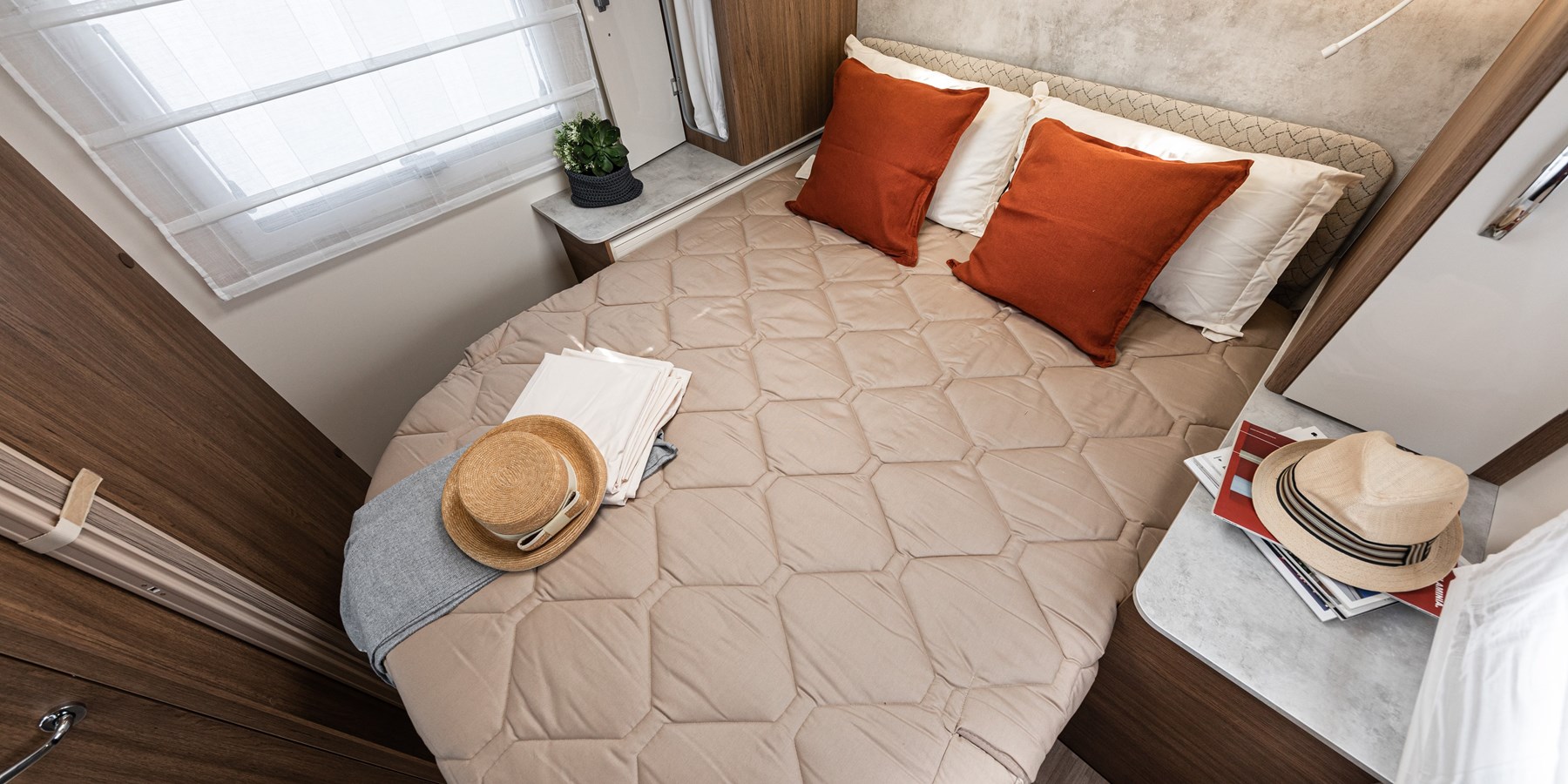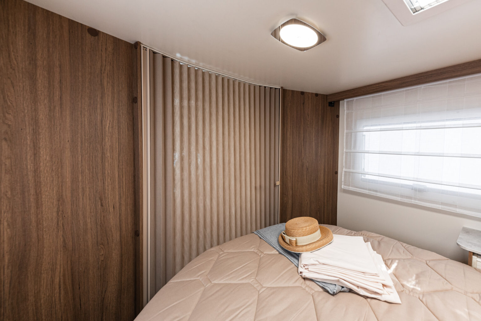 - Patul pațios de două persoane, amplasat în partea din spate și având dimensiuni generoase de 190×150 cm, este ideal pentru relaxare pe 4 roți și odihnă optimă.