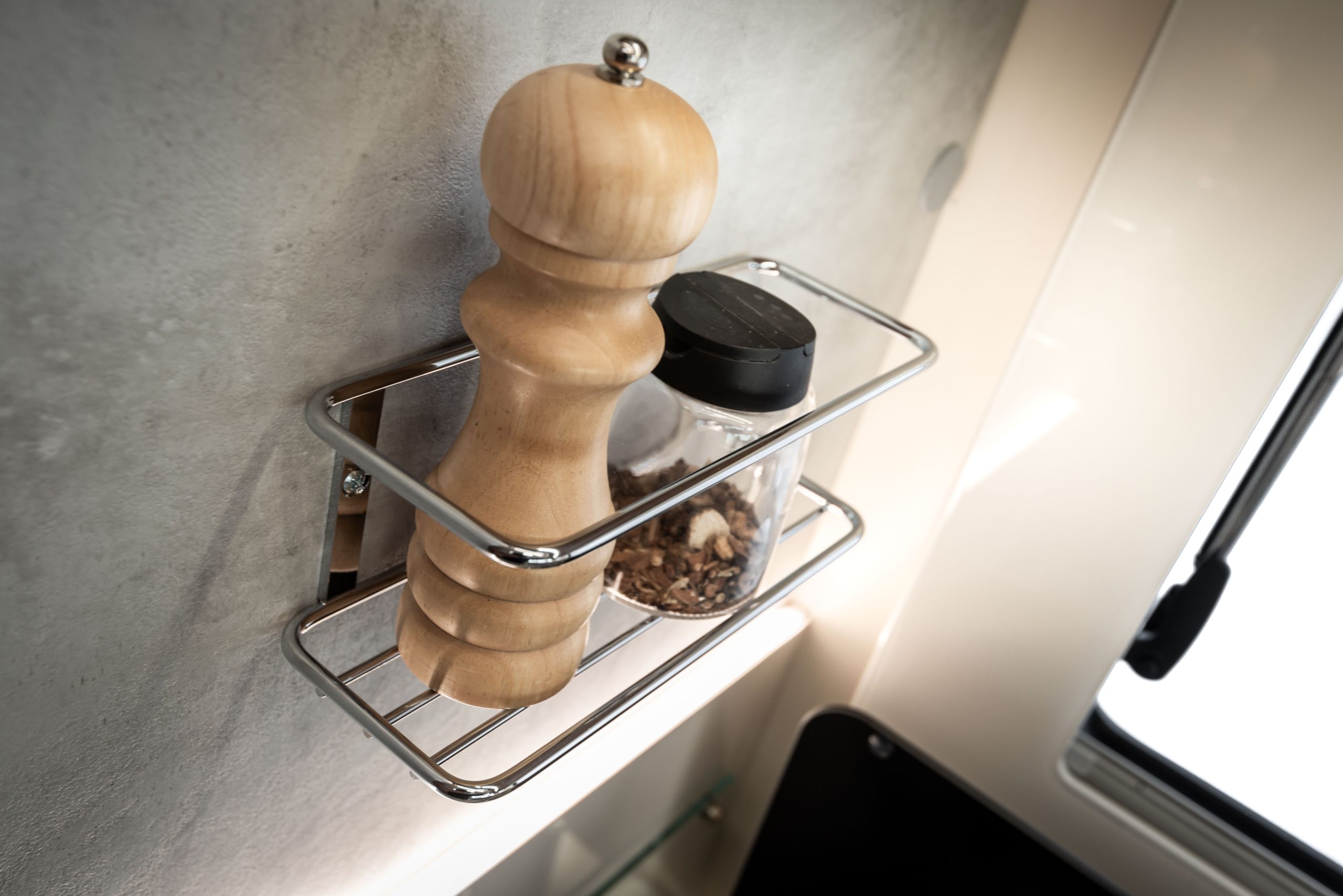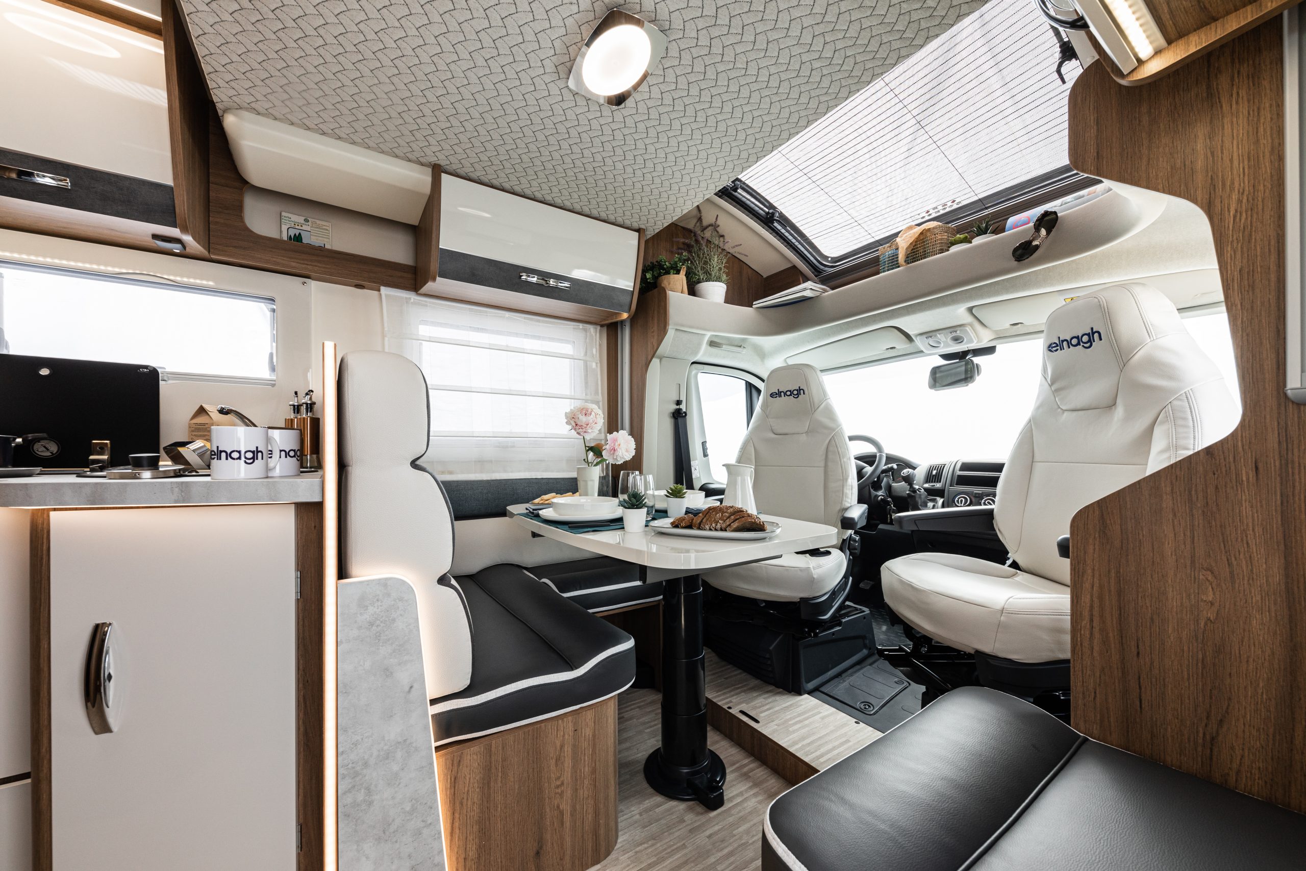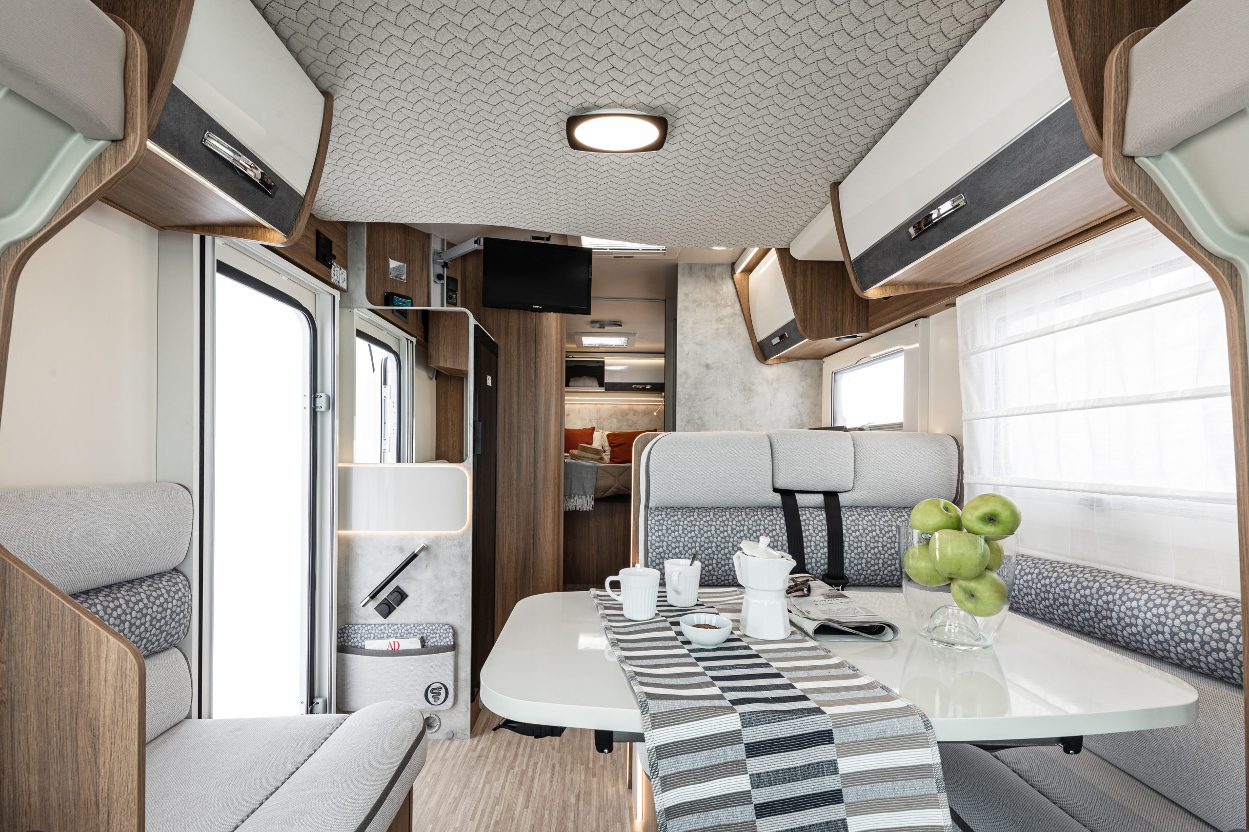 Designul interior urmează linia elegantă a gamei TREND: scaune pivotante cu huse căptușite, masă extensibilă, două luminatoare standard și opțional un acoperiș panoramic care amplifică lumina naturală. Zona de zi poate fi transformată într-un loc de dormit auxiliar (156×95 cm), perfect pentru un copil sau oaspeți ocazionali.