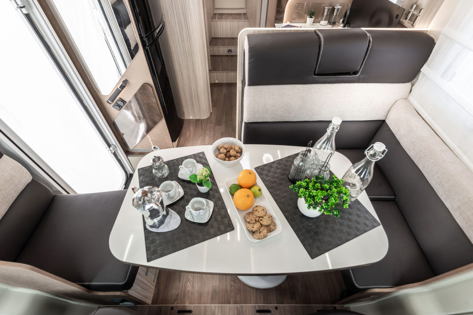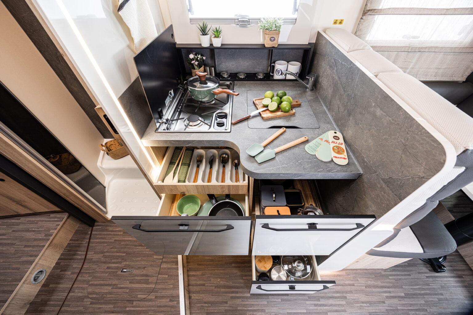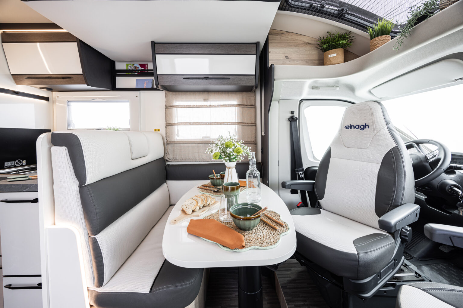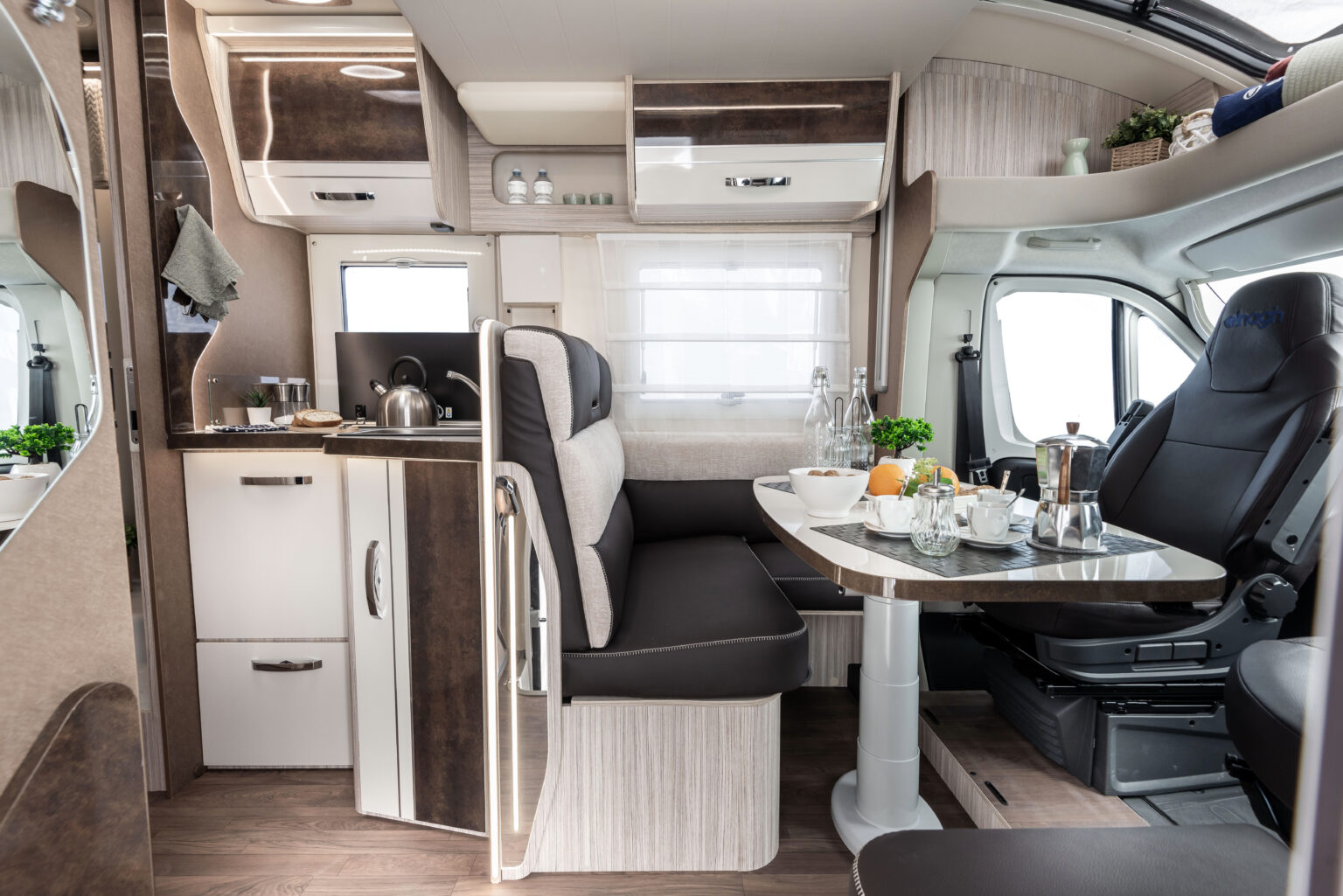 Spațiile interioare sunt optimizate inteligent, oferind 5 locuri omologate și 5 locuri de dormit, ideale atât pentru cupluri, cât și pentru familii numeroase. Atmosfera este caldă și primitoare, datorită tonurilor elegante și finisajelor lucioase aplicate pe mobilier. Profilurile LED și mânerele cromate adaugă un plus de rafinament.