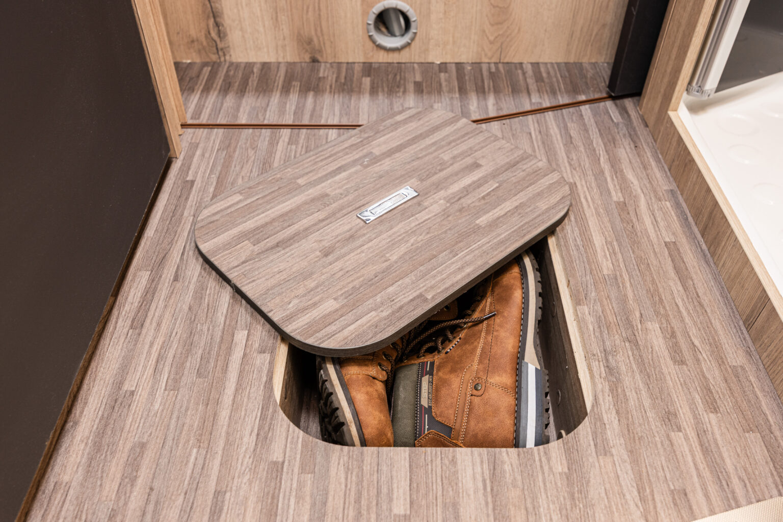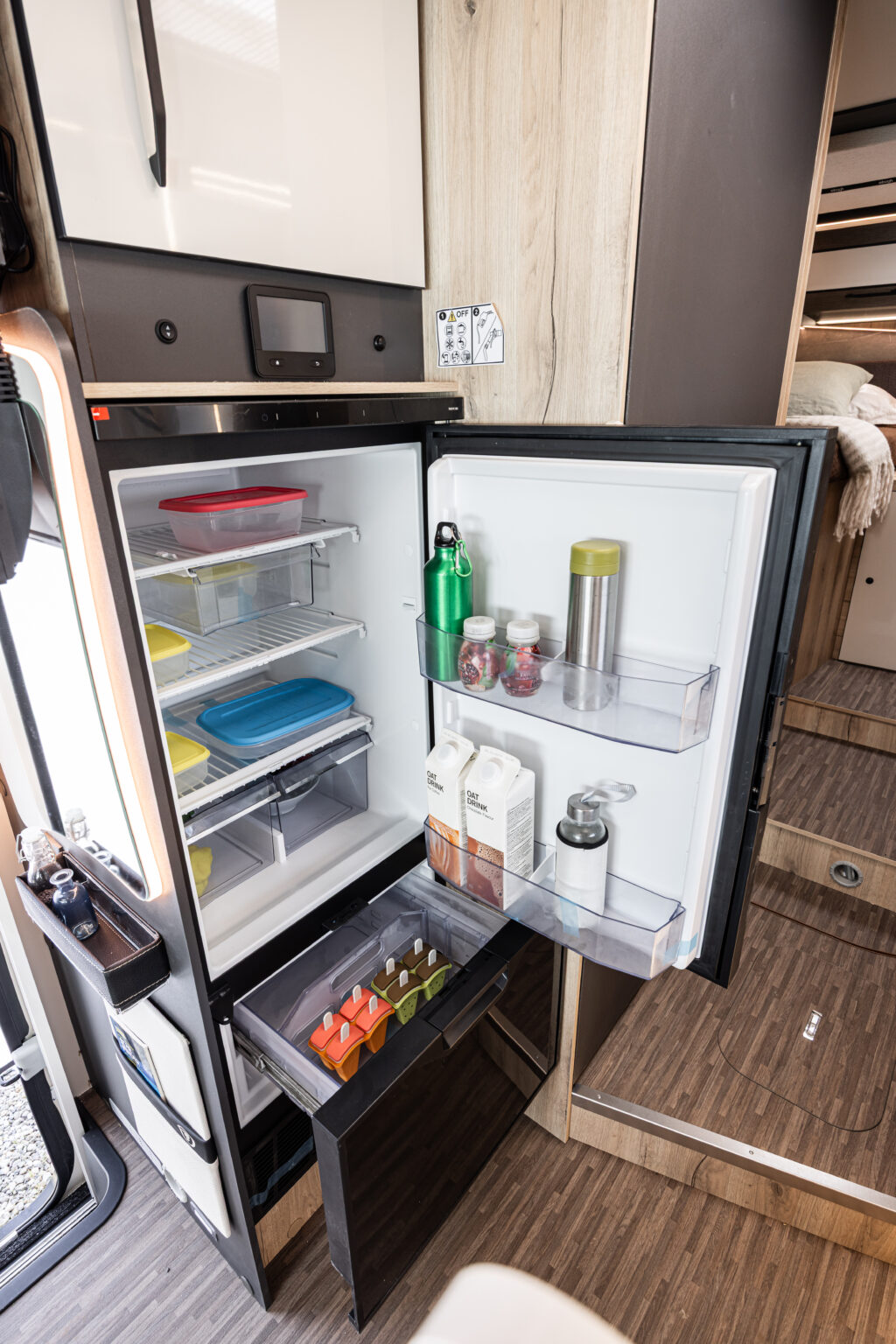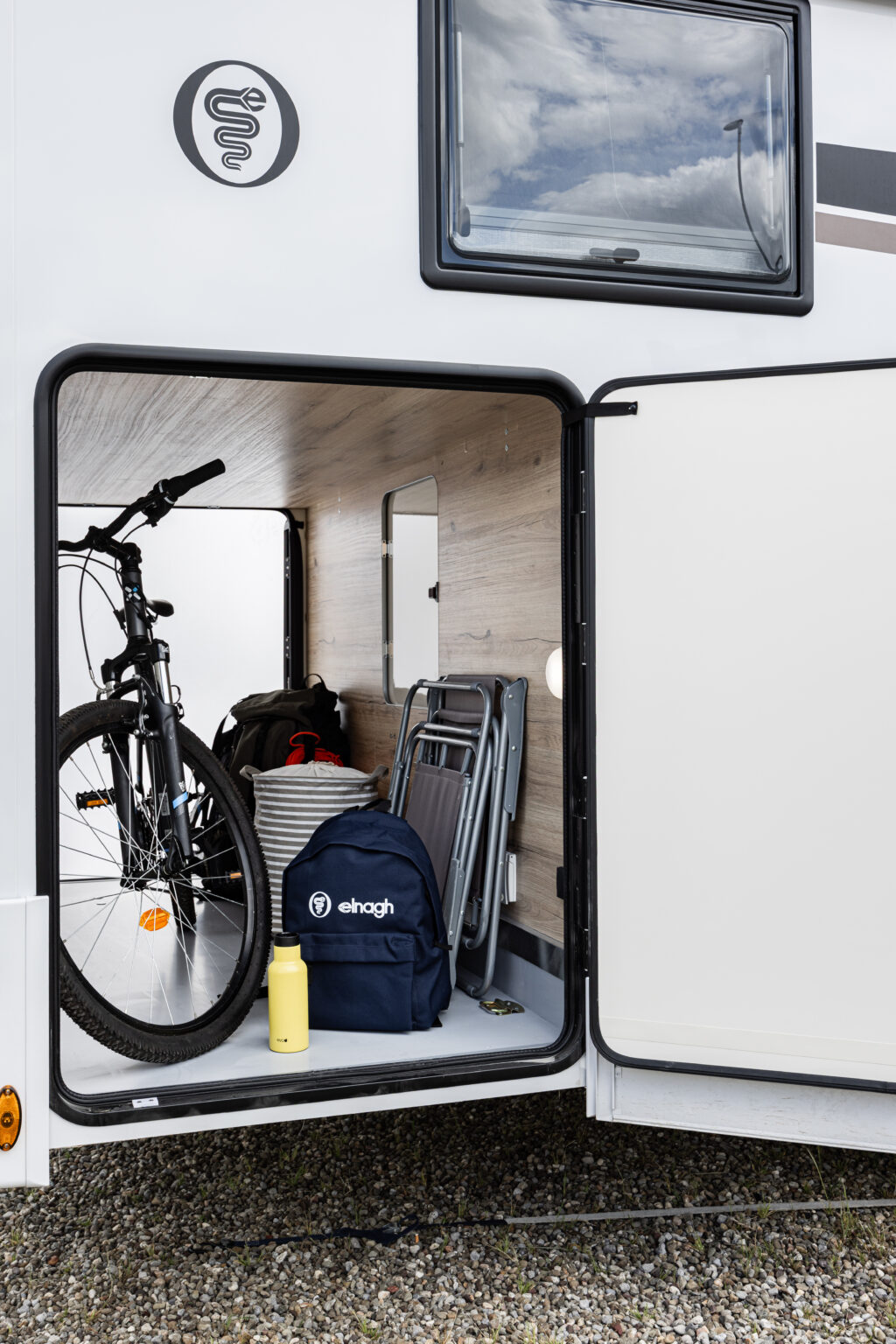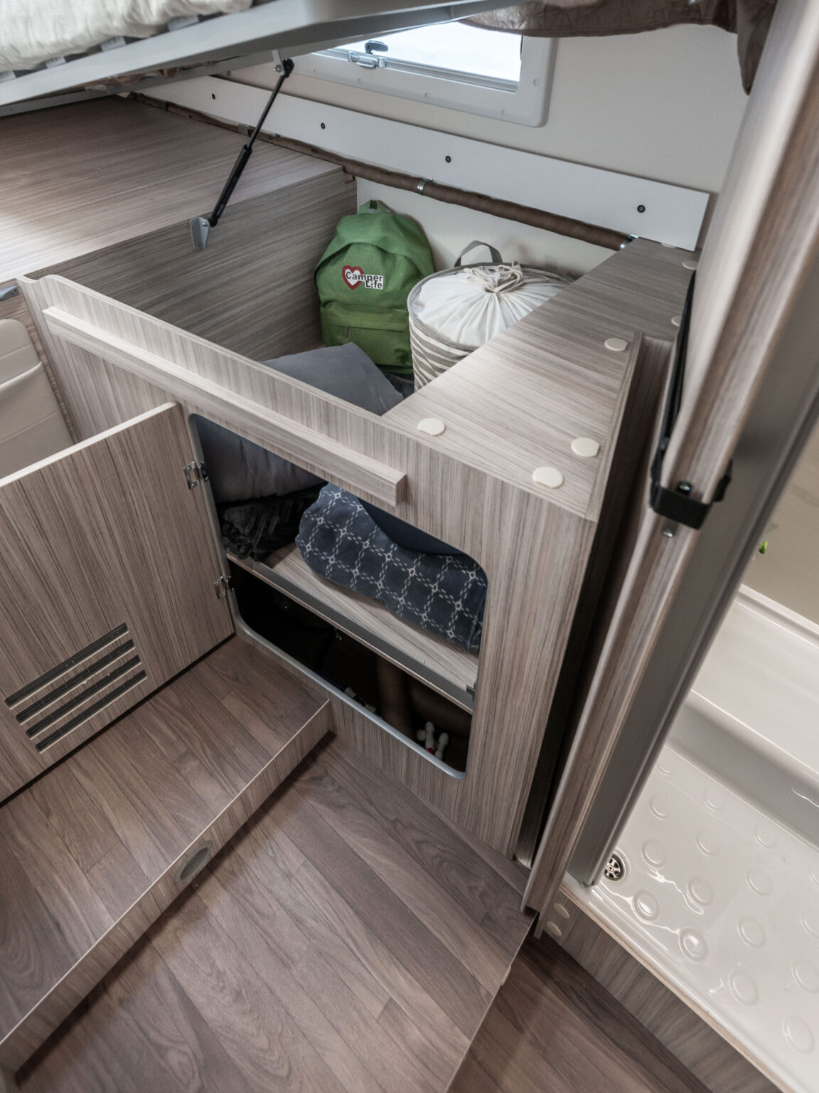 Spațiile de depozitare sunt generoase, incluzând un locker cu deschidere utilă de 115×95 cm. Autorulota dispune și de un rezervor de apă curată de 100L și un rezervor de ape uzate de 100L, oferind autonomie ridicată pentru orice traseu.